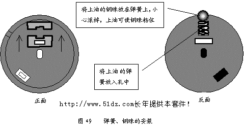 11 机械部分的安装与调整 11.1 提把的安装 后盖側面有两个О"小孔,是提把铆钉安装孔。观察其形状,思考如何将其卡入,但注意现在不能卡进去。 提把放在后盖上,将两个黑色的提把橡胶垫圈垫在提把与后盖中间,然后从外向里将提把铆钉按其方向卡入,听到咔嗒"声后说明已经安装到位。如果无法听到咔嗒"声可能是橡胶垫圈太厚,应更换后重新安装。 大拇指放在后盖内部,四指放在后盖外部,用四指包住提把铆钉,大拇指向外轻推,检查铆钉是否已安装牢固。注意一定要用四指包住提把铆钉,否则会使其丢失。 将提把转向朝下,检查其是否能起支撑作用,如果不能支撑,说明橡胶垫圈太薄,应更换后重新安装。 11.2 电刷旋钮的安装 取出弹簧和钢珠,并将其放入凡士林油中,使其粘满凡士林。加油有两个作用:使电刷旋钮润滑,旋转灵活;起黏附作用,将弹簧和钢珠黏附在电刷旋钮上,防止其丢失。 将加上润滑油的弹簧放入电刷旋钮的小孔中(见图49),钢珠黏附在弹簧的上方,是、注意切勿丢失。