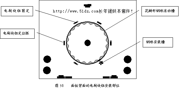 观察面板背面的电刷旋钮安装部位(见图50),它有3个电刷旋钮固定卡、2个电刷旋钮定位弧1个钢珠安装槽和1个花瓣形钢珠滚动槽组成。
