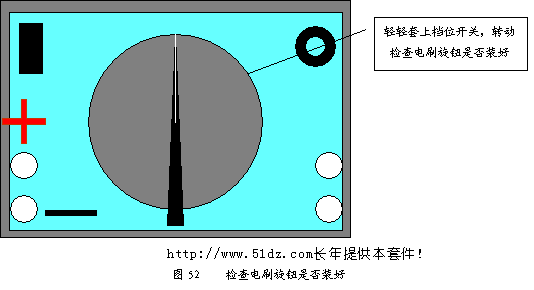 将面板翻到正面(见图52),档位开关旋钮轻轻套在从圆孔中伸出的小手柄上,慢慢转动旋钮,检查电刷旋钮是否安装正确,应能听到咔嗒"、咔嗒"的定位声,如果听不到则可能钢珠丢失或掉进电刷旋钮与面板间的缝隙,这时档位开关无法定位,应拆除重装。