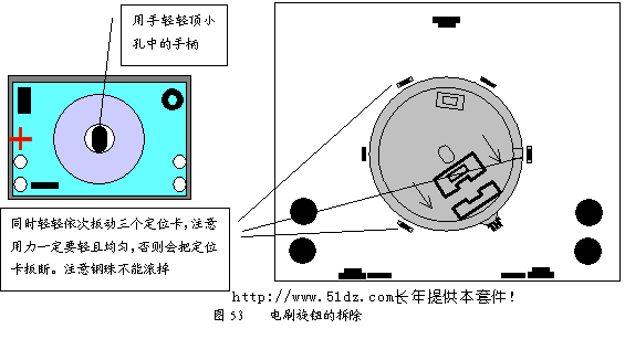 将电刷旋钮平放在面板上(见图51),注意电刷放置的方向。用起子轻轻顶,使钢珠卡入花瓣槽内,小心滚掉,然后手指均匀用力将电刷旋钮卡入固定卡。
