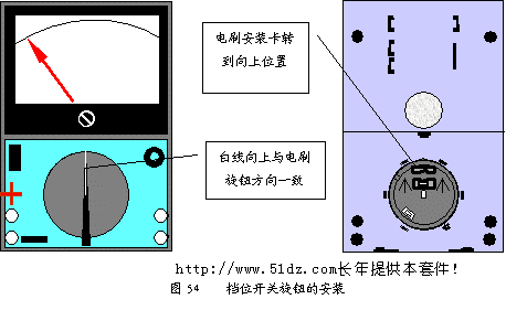 11.3 档位开关旋钮的安装 电刷旋钮安装正确后,将它转到电刷安装卡向上位置(见图54),将档位开关旋钮白线向上套在正面电刷旋钮的小手柄上,向下压紧即可。