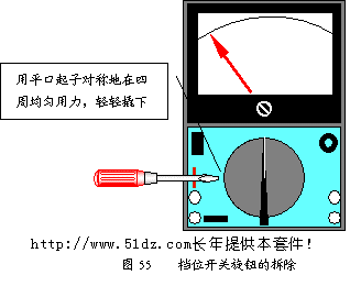 将档位开关旋钮轻轻取下,用手轻轻顶小孔中的手柄(见图53),同时反面用手依次轻轻扳动三个定位卡,注意用力一定要轻且均匀,否则会把定位卡扳断。小心钢珠不能滚掉。