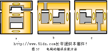 如果电刷安装的方向不对,将使万用表失效或损坏(见图57)。图中a开口在右上角,电刷中间的触点无法与电刷轨道接触,使万用表无法正常工作,且外侧的两圈轨道中间有焊点,使中间的电刷触点与之相磨擦,易使电刷受损;b.c使开口在左上角或在右下角,3个电刷触点均无法与轨道正常接触,电刷在转动过程中与外侧两圈轨道中的焊点相刮,会使电刷很快折断,使电刷损坏。