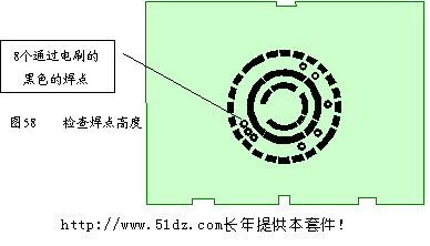 11.5 线路板的安装 电刷安装正确后方可安装线路板。 安装线路板前先应检查线路板焊点的质量及高度,特别是在外侧两圈轨道中的焊点(见图58),由于电刷要从中通过,安装前一定要检查焊点高度,不能超过2mm,直径不能太大,如果焊点太高会影响电刷的正常转动甚至刮断电刷。