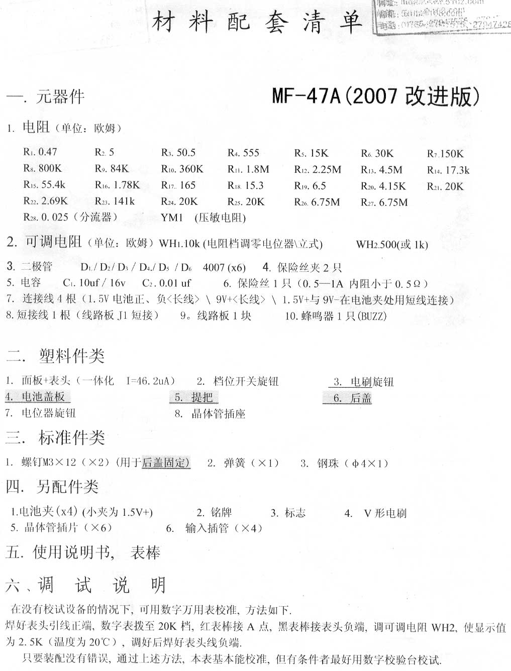 6 MF47型万用表安装步骤 6.1 清点材料 6.2 二极管、电容、电阻的认识 6.3 焊接前的准备工作 6.4 元器件的焊接与安装 6.5 机械部件的安装调整 6.6 万用表故障的排除 6.7 万用表的使用 6.8 考核要求