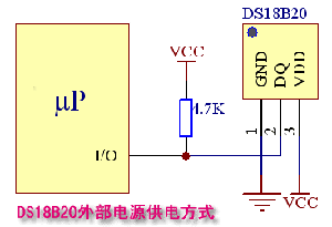 外部电源供电方式是DS18B20最佳的工作方式,工作稳定可靠,抗干扰能力强,而且电路也比较简单,可以开发出稳定可靠的多点温度 监控系统。站长推荐大家在开发中使用外部电源供电方式,毕竟比寄生电源方式只多接一根VCC引线。在外接电源方式下, 可以充分发挥DS18B20宽电源电压范围的优点,即使电源电压VCC降到3V时,依然能够保证温度量精度。