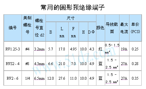 本站根据大家的需要准备几款常用的圆型预绝缘端子供大家选用,圆型预绝缘端子的数量大家可以根据需要而定,只要其中一种也行,为了减少本站工作人员的工作量,其每种数量不能少于10个,还望大家谅解。   共三种型号,每种6个,合计18个包为一包,合计金额5.28元。