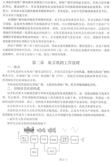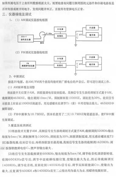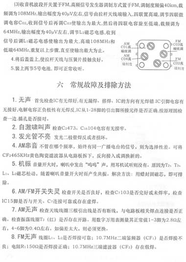 调幅(AM)部分:中波调幅广播信号邮磁棒天线线圈T1和可变电容C0、微调电容C01组成的调诣回路选择,送入IC第10脚。本振信号邮振荡线圈T2和可变电容C0、C04微调电容及与IC第5脚的内部电路组成的本机振荡器产生,并与由IC第10脚送入的中波调幅广播信号在IC内部进行混频,混频后产生的多种频率的信号,经过中频变压器T3