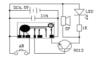 通电后AN没有闭合,电路处于待机状态,当按下AN后,触发端得到触发信号,门铃芯片输出端输出“叮咚”的音乐信号输入到三极管9013放大,推动喇叭发声,同时并联在喇叭上的LED发光,1K的电阻为LED的限流电阻。当响完三次后,又回到待机状态,等待下一次触发。