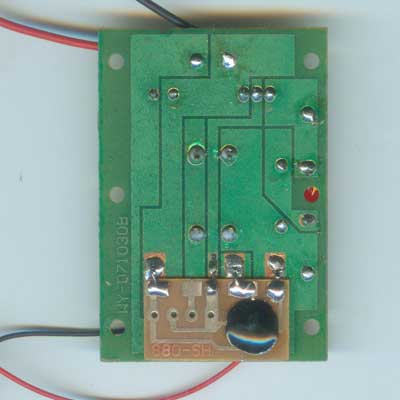 l 用剪下来的元件引脚给音乐IC焊上,IC焊到锡脚的这一面,引脚插到板上焊好。
