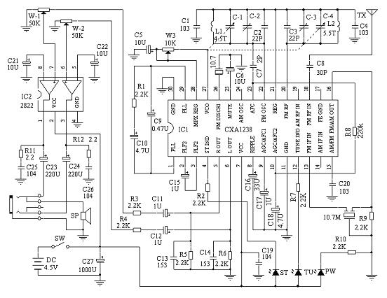 原理和原理图从变压器输出的交流电输入到AC插座,由D1—D4组成的整流桥整流后,输出直流电给整机供电;直流电从DC插座输入。C31、C21、C26为滤波电容,给功放IC 2822和收音集成电路CXA1238供电。CXA1238为SONY公司开发的带AM和FM立体声超外差接收电路,这里只采用了FM立体声接收功能,所以波段选择引脚15脚应为高电平(如为接收AM波段的该脚接地)。高频信号经天线、C8耦合到信号输入引脚18脚,经内部放大,20脚外接的C3、C-4、C-5、L2调谐选出要接收的频率信号送到混频级,22脚外接的C2、C-1、C-2、L1组成本机振荡电路,产生的振荡信号也送入混频级和接收信号混频,从16脚输出10.7MHz的中频信号,经三端陶瓷滤波器滤除10.7MHz以外的信号后从13脚送回内部进行中频放大和立体声解码,最后从5脚、6脚输出左右声道的音频信号送往音量调节电位器,再送由TDA2822组成的功放电路进行音频功率放大,最后从耳机插座输出推动耳机或喇叭发声。