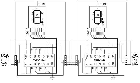 1寸数码管显示板(光板),每片0.5元。该板主要为单片机端口扩展用的,可以1级到多级的连接使用(本站曾经使用过四十多级给客户开发过产品)。使用1寸红色超亮共阳数码管,一个笔画由一个LED组成,所以+LED电源取5V即可。电阻和74HC164为贴片元件,体积小巧。板上有四级连接在一起,其中各级间已经预留有开口,如果不用四级,可以分别掰开使用(下面的图为已经掰开了一级),如果要使用四级以上的,也可以很方便的首尾相接起来使用。