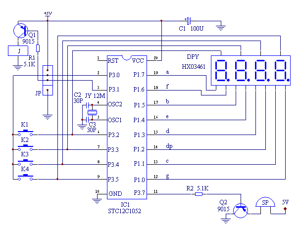 电路采用扫描显示接法,通电后,单片机芯片内部电路复位,所有IO口回到初始状态。然后软件编程先使P3.2口输出高电平,P3.3、P3.4、P3.5为低电平,然后再给第一位数码管要显示的笔画置低电平,经过一段时间后,把P3.3口置高电平,P3.2、P3.4、P3.5置低电平,再给要在第二位显示的笔画置低电平。。。显示完所有位后又返回第一位,就这样一直反复着。四位数码管都是在不同的时间显示,但由于转换的速度很快,我们看到就好像在同时显示一样。K1、K2、K3、K4用于设置时间、模式、启动/停止,也是接在P3.2—P3.5上,公共端接到P3.0口上,这样就可以实现共用又不相冲突。P3.7输出的响铃信号经R1送到三极管9015进行放大,推动蜂鸣器发声。P3.1用于控制继电器,刚开始设置成高电平,当倒记时间到后,P3.1输出低电平,Q1导通,继电器吸合。