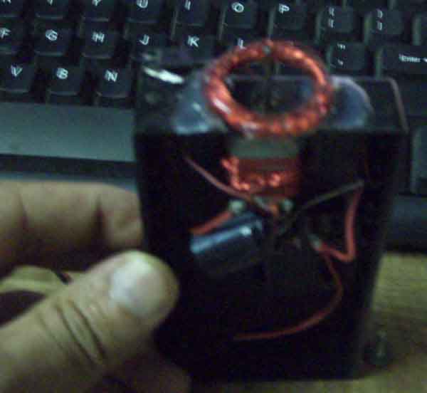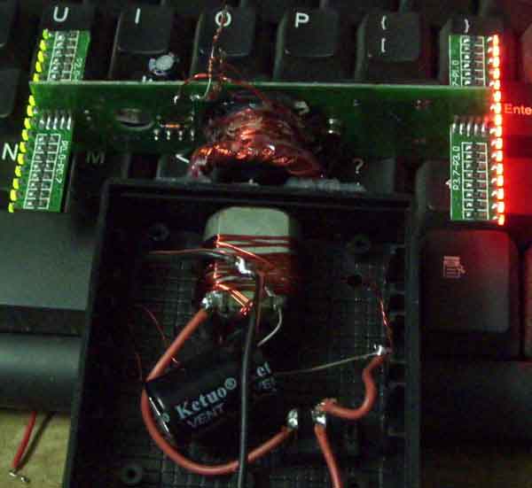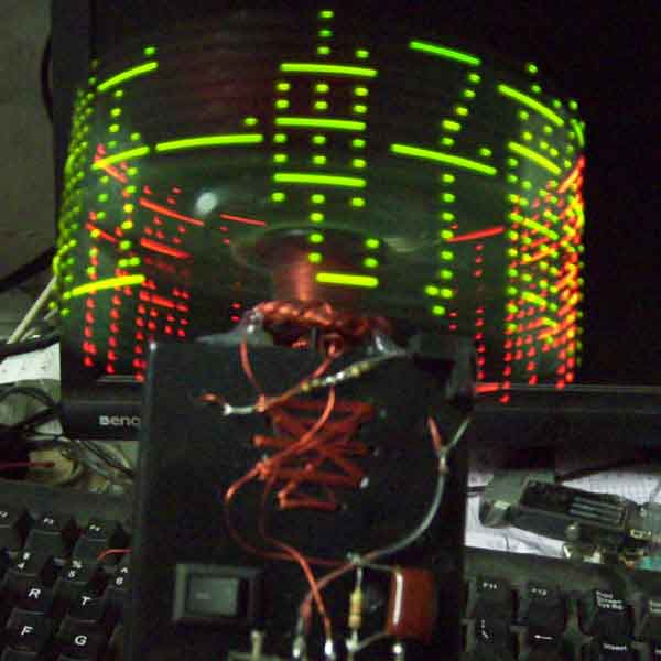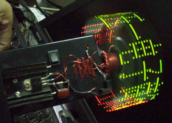 这是正在转动时的效果。本制作采用一个玩具上的劣质电机,用线将电机捆在盒子上固定,采用无线输电技术,将电源无线连接送给转动的LED板上让LED显示发光。所谓的无线输电技术,就是没有接点供电,利用电磁转换原理,大家可以看出我手工绕制的线圈非常的简陋。