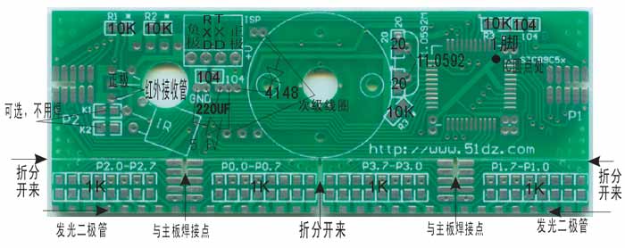 本站现在只需49.99元就可以购买旋转点阵的全部元件(含电动机),但是单购本电路板则收13.8元,凡在本站购买本套件,本站授权免费使用字符点阵自动生成代码的软件,而在贪图便宜在别站购买非本站的类似套件的话,请不要使用本站的字符点阵自动生成代码。另请注意:本站提供的该套件会不停的改良,大家看到的图片会有很大的差别,警请留意!