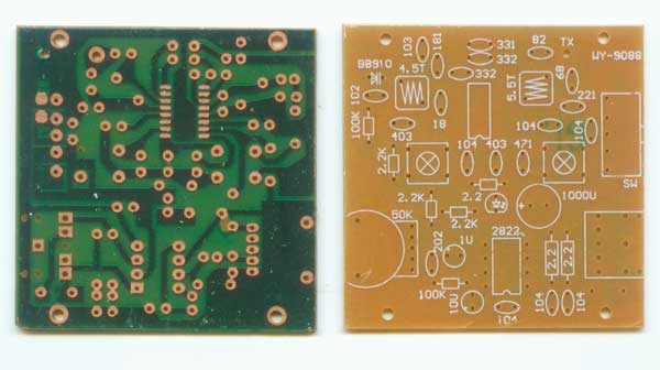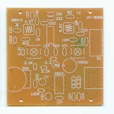 9088收音电路板,规格:55×55mm,9088是一块自动扫描频率的单片收音机电路。高频广播信号经天线接收,C2、C3、C4、L1选频网络选频后从IC的11脚、12脚输入,5脚为本机振荡回路,两路信号经内部混频,从IC的8脚输出70KHz的中频信号,后经⑨脚输入到内部放大鉴频后从2脚输出音频信号。1脚为静噪控制,当接收不到信号或信号比较弱时,使2脚输出信号衰减很大,实现静噪。16脚为扫描频率控制端,当电源接通,输出控制信号加到变容二极管B910上,使其容量从高到低发生变化,使本机振荡频率从低到高发生变化,也就是接收频率从低端向高端扫描,当收到一定强度的信号即停止扫描,锁定在当前频率,此时按下K2电路继续向高频率端扫描。15脚为复位脚,当扫描到最高频率后,不能再向频率低端扫描,要跳到低端频率只能按复位按钮复位电路,再向高端扫描。