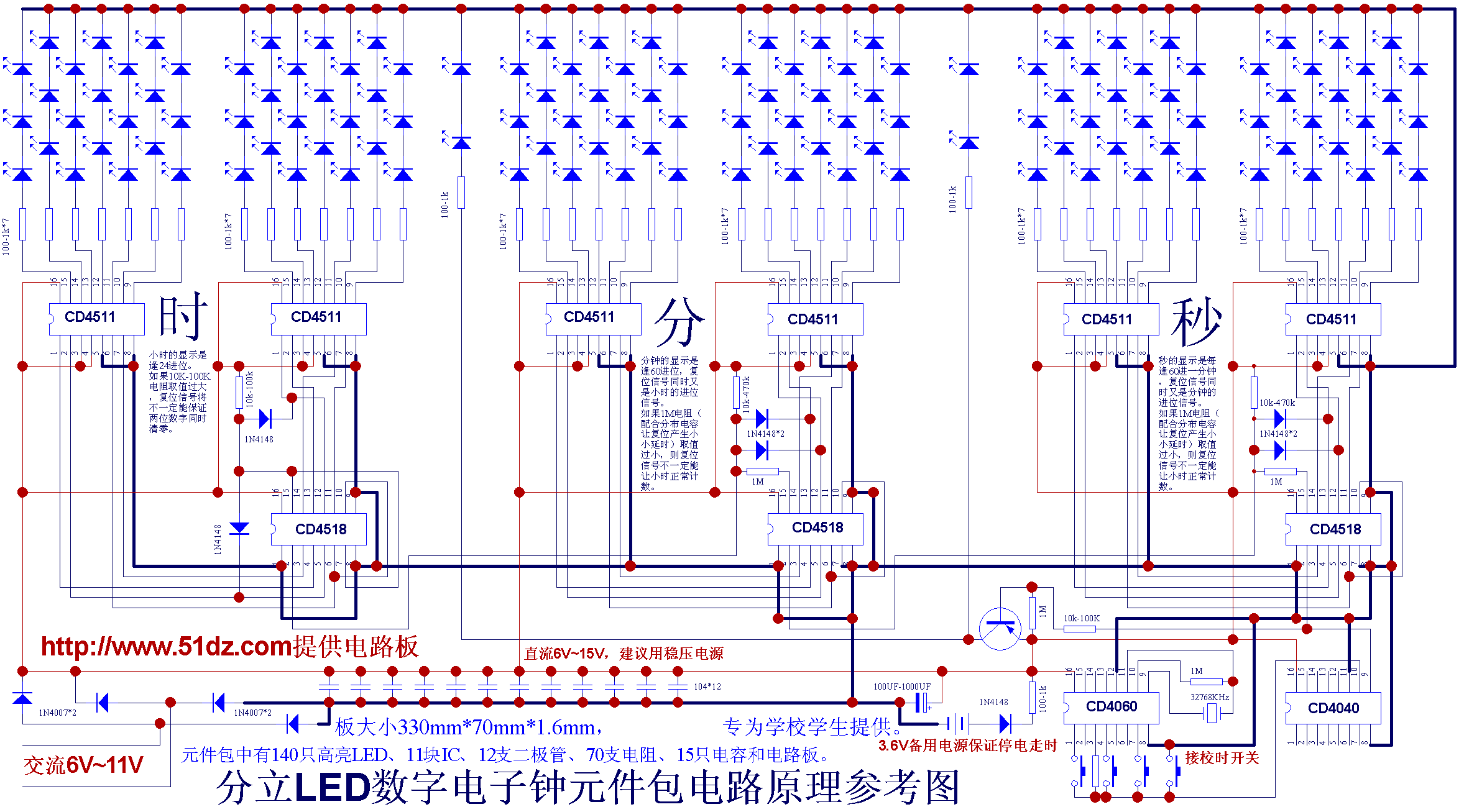 2、纯硬件电路,石英晶体振荡器为时间基准,走时精度高。主要元件:4543六支、4518三支、4040和4060各一支、超亮度发光管130只等元件。