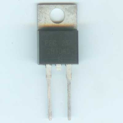 看上去好象是中间的引脚剪掉了,其实本来就是这个样子的,因为这是一个大电流整流二极管,10A的电流,但是耐压只有45V,常用于开关电源的次级整流,属于高频整流二极管,DIP-263封装。