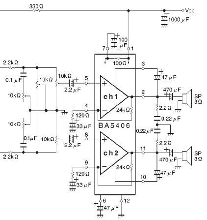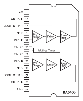 BA5406:5W双声道OTL立体声功率放大器。电压12V