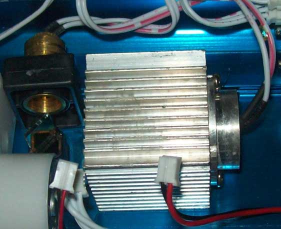 如图,大大的正位安装的铝合金散热那个是绿色激光头,侧位黑色支架铜散热的那个是红色激光头,估计整台机的成本就贵在这两只激光头上了。