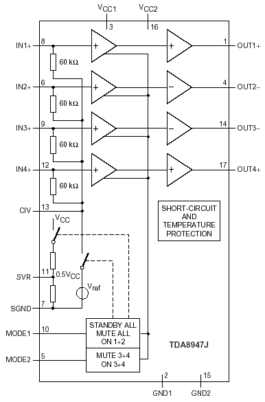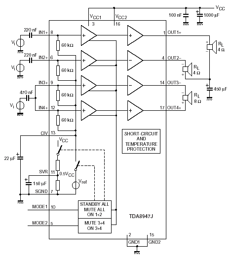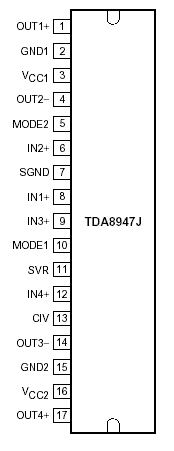 内部有四个OTL功率放大器,工作电压10-26V,可以做成两个BTL功放,也可以做一个BTL+两个单声道功放(即2.1系统),适合做汽车功放IC,特别适合12V、24V通用,本站有采用这个芯片的汽车音响出售。