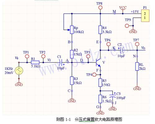 分压式偏置放大电路是一个常用放大电路。利用电路的结构能稳定放大电路的静态工作点。电路原理图如图1-1所示。