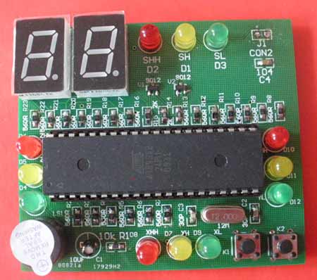 将烧录好程序的芯片插上(我们提供的芯片中已烧录好程序),由于这个芯片引脚较多,在插入插座时要格外小心,防止其中几个脚折弯。所有元器件安装好后,通电,可看到两位数码管显示“25”,同时主道亮绿灯,干道亮红灯,然后开始做时间递减操作。当显示为“05”时,黄灯点亮,同时蜂鸣器每隔一秒叫一声,当计时结束后,主干道通行状态改变,即主道亮红灯,干道亮绿灯,此时两位数码管显示“20”,然后作递减操作,结束后重复前面的动作。当人为地按下紧急通行键时,若按的是主道紧急通行键,则干道亮红灯,主道亮绿灯,数码管从“50”开始倒计时,同理,若按的是干道紧急通行键,则通行的方式与前正好相反。50S结束后,系统自动返回按键前的工作状态。