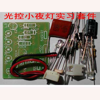 | 光控小夜灯套件:利用光敏电阻感测环境亮度,天黑了就点亮4个LED发光,产品比传统小夜灯省却开关部分,无须人手控制,发光部分采用LED,在亮度达到传统光管式小夜灯的同时,功耗更低,效果不错,欢迎在家试作。
