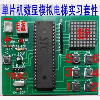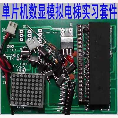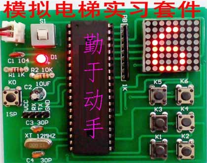 单片机点阵模块组成的模拟电梯实验套件: 电梯是集机械原理应用、电气控制技术、微处理器技术、系统工程学等多学科和技术分支于一体的机电设备,它是建筑中的永久垂直交通工具。本文选择STC89C52RC为核心控制元件,设计了一个六层电梯系统,实现运送乘客到任意楼层,并且显示电梯的楼层和上下行。利用单片机控制电梯有成本低,通用性强,灵活性大及易于实现复杂控制等优点。