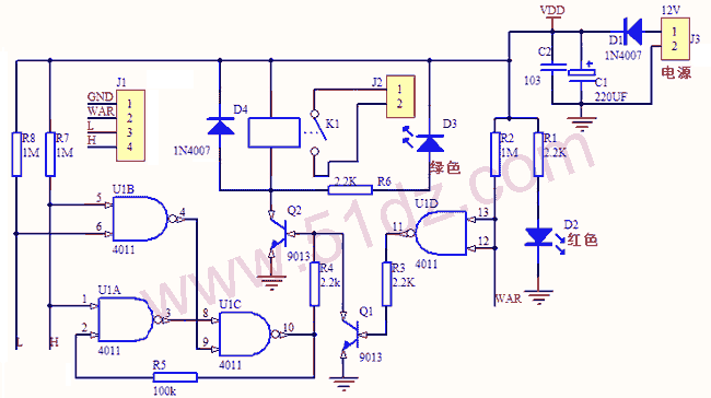 12V直流电压经D1,一路经R1点亮发光管LED1,作为电源指示,另一路作为系统的工作电源。接通电源后,如果水箱中没有水,则两个水位探头经R7、R8与正电源相连,即为高电位,U1的4脚输出低电平,经U1C处理后,10脚输出高电平,这个高电平一路经R4加在Q2的基极,使Q2饱和导通,继电器得电吸合,启动水泵抽水;另一路经R5接到U1的2脚,由于高水位探头也为高电平,经与非门处理后,U1的3脚输出为低电平,将U1C与非门锁住。随着水泵不断向水箱供水,水箱中的水位逐渐升高,当低水位探头浸到水后U1的6脚变为低电平,4脚输出高电平,但此时与非门已被锁住,故而不会影响输出,水泵继续抽水;随着水位的进一步升高,当水位碰到高水位探头时,U1的1脚和6脚都变为低电平,这个变化对U1的4脚没影响,而3脚却因1脚变为低电平,输出为高电平,这样U1的8、9脚都是高电平,10脚便输出低电平,继电器失电断开,水泵停止抽水,同时这个低电平又经R5加在2脚上,使3脚保持高电平。直到水位再次低于低水位探头时,又将重前述过程,从而对水箱的水位实现自动控制。本电路中,设计有故障保护电路,当高水位探针因电极氧化发生故障时,无法发出停机信号,此时水位继续上升,当WAR端探针浸入水中时,将强行使水泵停机,以作为保护之用。