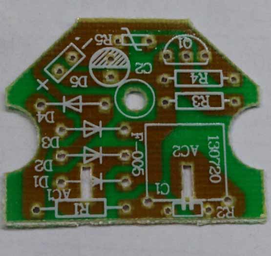 电路工作原理:C1 R1阻容降压,R2为电容放电电阻,经过D1~D4全波整流后,C2滤波;三极管B极电压由R3和光敏电阻分压决定,当环境亮度足够时,R5阻值较小,B极电位较低,三极管不导通,LED熄灭,当环境亮度不足时,R5阻值升高,B极电压随之升高,达到3只LED串联压降+0.7V后,三极管导通,LED得电工作。D5和D7装的是发白光二极管,D6装的是七彩二极管;为他发光二极管焊接牢固本站已经经工厂的机器将发光二极管串联焊接了。大家就用电烙铁焊接也是可以的,不过不够牢固。