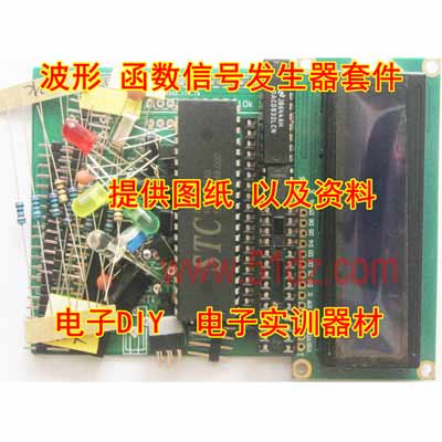 带屏函数信号发生器套件:本套件是利用STC89C52单片机和数模转换器件DAC0832产生所需不同信号的低频信号源,即采用STC89C52 单片机作为控制核心,而在外围采用数字/模拟转换电路(DAC0832)、运放电路(LM358)、按键和LCD液晶显示电路等,通过按键可控制产生方波、锯齿波、三角波、正弦波,同时用LCD液晶显示对应的波形输出。设计过程中主要实现利用按键来控制不同波形的输出,当按键1按下时,函数发生器就切换不同的波形;当按键2按下时,函数发生器就加频率;当按键3按下时,函数发生器就减频率;当按键4按下时,函数发生器就进入调节步进值。