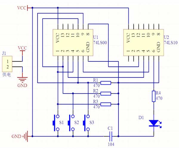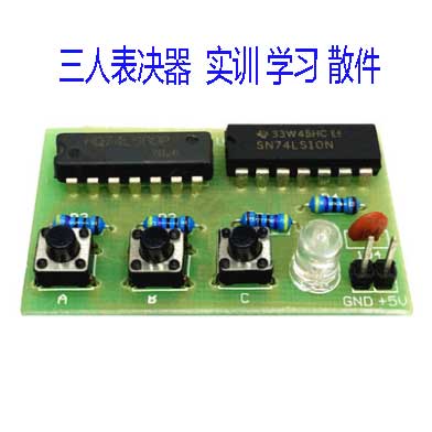三人表决器套件功能说明:三个评委各控制A、B、C三个按键中一个,以少数服从多数的原则表决事件,按下表示同意,否则为不同意。若表决通过,发光二极管点亮,否则不亮。