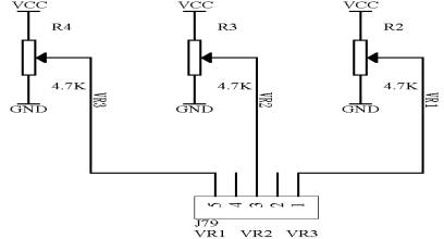 此模块主要是用于提供0-5V之间的可变的模拟电压值,即可以作为参考电压源也可以作为模拟电压信号。这三路是相互独立的。分别对应着由VR1,VR2,VR3端口输出。具体的电路原理图如图1.3所示: