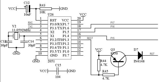 该系统板上的单片机系统把全部的I/O端口资源提供出来,因此,在实际应用的时候,可以灵活地组合成不同的单片机应用系统,该单片机采用12MHZ晶振,具体的电路原理图如图1.17所示: