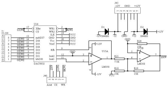 系统板上的数模转换模块采用了8位的D/A转换芯片DAC0832来完成数模转换过程,DAC0832是电流输出型D/A转换芯片,因此,后面接有集成运放LM358来完成电流到电压的转换。其中的数字信号的输入从“D0-D7”端口输入,控制DAC0832工作的控制信号由“WR CS”端口输入,模拟量的输出从“AOUT”端口输出,由于LM358工作在双电源条件下,因此要给LM358加入±12V电压,从“+12V GND -12V”端口加入。具体的电路原理图如图1.16所示: