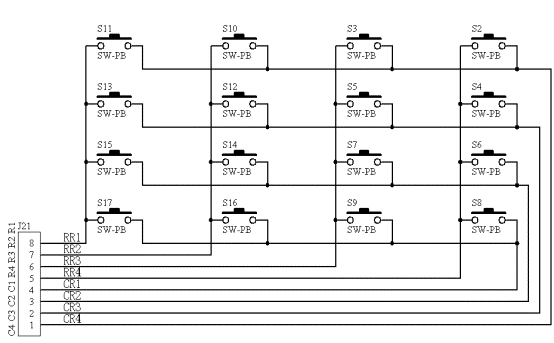 行列式键盘也即矩阵式键盘,它由行和列组成,在每个行列的交叉点上放置一个按键,这样4×4行列式键盘共需要16个键盘组成;具体的电路原理图如图1.23所示: