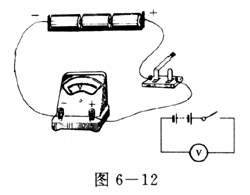 (2)取二三节干电池,分别测出每节的电压.再将这几节干电池串联组成电池组,测出串联电池组的电压(图6-12).记下测得的数据.回答:串联电池组的电压跟各节电池的电压之和有什么关系?