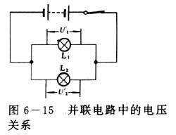 按照图6-15连接成并联电路,用电压表分别测出:灯泡L1两端的电压U`1,灯泡L2两端的电压U`2.记下测量结果.回答:在并联电路里,各支路两端的电压间有什么关系?