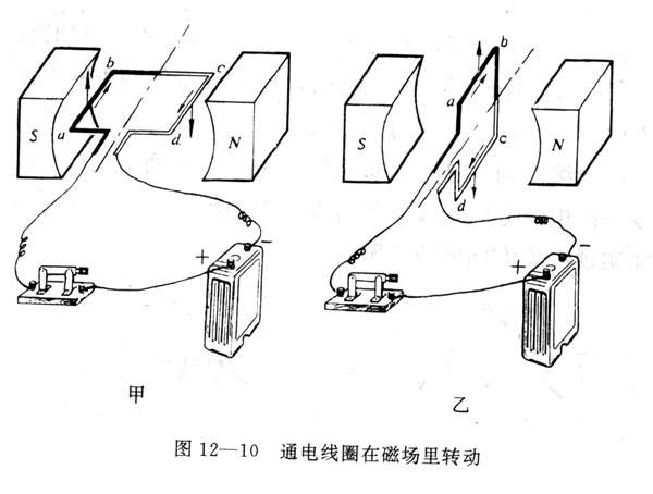 图12-11表示图12-10中的通电线圈刚转过平衡位置时的受力情况,对此图12-11的甲和乙可以知道:如果在线圈刚转过平衡位置时,立即改变线圈中的电流方向,那么,由于受力方向改变,线圈就可以按原来的方向继续转动。这样,每当线圈刚转过平衡位置,就改变一次电流方向,线圈就可以不停地转动下去。怎样具体实现电流方向的改变呢?