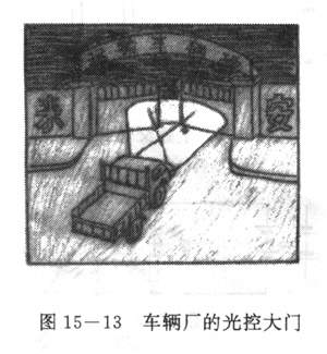 图15-10是应用光敏电阻的基本电路、电路中的光敏电阻受到光照射时,电流相当强,用电器可以正常工作.而当光敏电阻不受光照射时,阻值增大,电流减弱,用电器停地工作。下面举两个具体例子。
