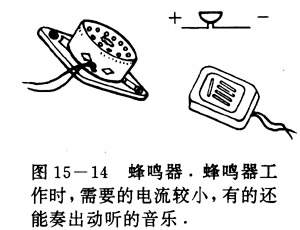 这里我们要用到另一种电子元件——蜂鸣器(图15-14)。蜂鸣器内装有发声电路,外边有两极引线,一根负极,一根正极。使用时正极接电池正极,负极接电池负极。当有电流通过时,能发出悦耳的蜂鸣声。