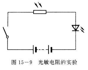 实验照图15-9那样连接电路.接通开关,先观察光敏电阻被光照射时发光二极管的发光情况,再观察光敏电阻被不透明物体遮盖时,发光二极管的发光情况.